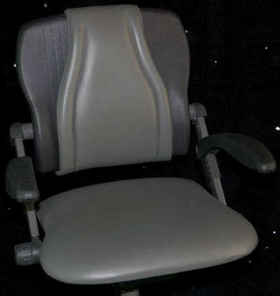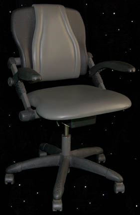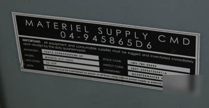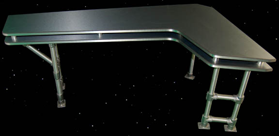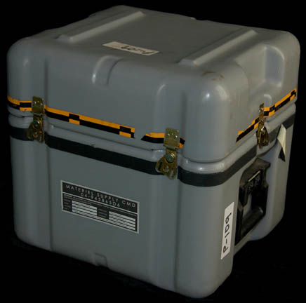 Description: A freestanding desk and chair built in the style present on “Enterprise NX-01” appearing in various episodes of Star Trek: Enterprise like “Cold Front” and “Future Tense”. The desk is made from two layers of sturdy L-shaped wood with beveled edges and covered in metallic silver, the legs are silver colored aluminum with Speed Rail joints and feet with holes prepared for mounting to a base or deck. The underside of the desk features an inscription reading ‘ND Crew Quarters STE' and a label inscribed ‘Crew, Danial Quarters’. The item comes with an Enterprise style chair with a rolling five armed base on a size adjusting pedestal with a rocking back and height adjusting arms, the item is composed of high quality molded plastic with a gray vinyl seat cushion and back, and a gray Starfleet style footlocker with butterfly clasp seals and a hinged lid, the case features multiple ‘Starfleet Material Supply Command’ inventory applications, and two black spring handles and measures approx. 16 X 17 X 17 inches. The arms of the chair feature screw threaded fasteners, the one on the left is missing. The desk measures approx. 30 X 42 X 72 inches and the chair measures approx. 37 X 24 X 21 inches.