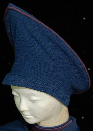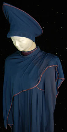 Description: “Guinan” (Whoopi Goldberg) was an ‘El'Aurian’; a humanoid species of “listerners” that live markedly longer than humans. This costume was made for wear by Guinan in the Star Trek: The Next Generation episode “Yesterday’s Enterprise”. It includes a blue tunic top with pleats around the body and mauve trim for detail, blue trousers, a corresponding blue over robe, a blue Guinan-style head piece and a purple dickie. Due to time and use there are a few stains around the collar on the tunic and on the dickie. Costume comes complete with costume tag.