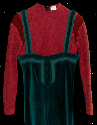 Description: A costume featured in the Deep Space Nine pilot episode “Emissary”, wherein a new crew takes over, “Commander Benjamin Sisko” (Avery Brooks) in command, an abandoned Cardassian station, renames it “Deep Space Nine”, and makes a singular discovery. This costume is for wear by Cirroc Lofton in the role of the new Commander's son “Jake Sisko”, and is a read/black shirt in a textured, diamond pattern, maroon accents just off the shoulders, a zip up the back, teal, corduroy trousers with green accents, attached suspenders, and stirrups for the feet. The costumer’s tag reads ‘Pilot DS9, Jake Sisko, Cirroc Lofton’.