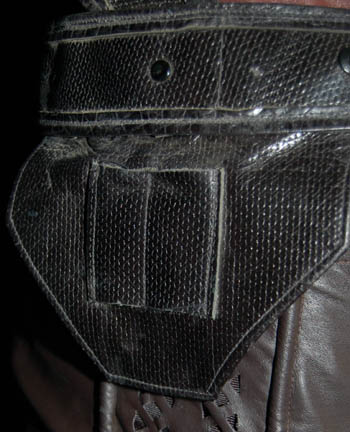 Description: A costume featured in various episodes of Star Trek: Enterprise like “The Andorian Incident” and “Cease Fire” for wear by “Tholos” (Stephen Dennis). The costume is brown vinyl trousers with a crisscross pattern on the outside seam, and a matching brown leather jacket with faux reptile skin trim, black leather gloves, a shoulder harness, and a belt with a black leather flap pocket pouch. The costume also comes with a solid cast resin Andorian energy carbine with an attached shoulder strap wrapped in black plastic tubing. The prop gun is painted an iridescent blue and reflects light measureing approx. 17 X 6 X 2 inches. Sewn in Enterprise tags read ‘David Venafro', and the costumer’s tags reads ‘Enterprise #041 Cease Fire’, ‘Andorian Incident Enterprise 007, Tholos, Stephen Dennis’.