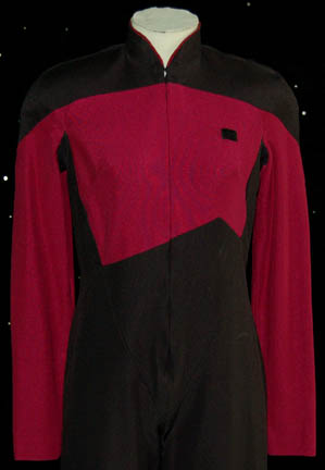 Description: A Star Trek: The Next Generation female Command red Starfleet uniform made for wear during the series and/or ‘The Next Generation' movies. The jumpsuit is black with Command red sleeves and upper torso. There is red trim around the collar, a small Velcro patch on the left breast for a Combadge (not included) to attach and a zip up the front. Costume comes with costume tag.