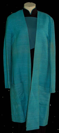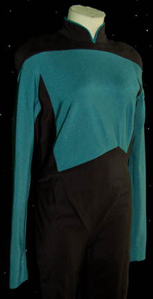Description: “Dr. Beverly Crusher” (Gates McFadden) was the Chief Medical Officer on board the Enterprise-D during the Star Trek: The Next Generation series. This is her Sciences blue Starfleet uniform and lab coat made for wear on the show. The uniform is black with Sciences blue torso and sleeves and a zip up the back. One of the accompanying costume tags reads “retire 6-93”. The lab coat is blue textured cotton with deep pockets in the front. The accompanying tag with the lab coat indicates it was for wear during seasons 4 – 7. Costume comes complete with costume tags.