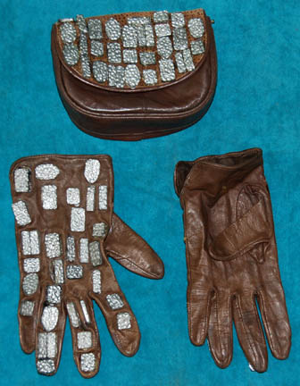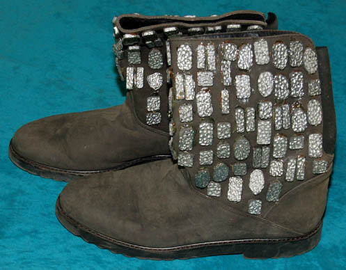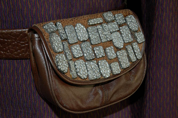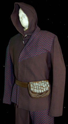 Description: A Klaestron male kidnapper (Tom Morga) featured in the Star Trek: Deep Space Nine episode “Dax” in which he assisted “Ilon Tandro” (Gregory Itzin) in his attempt to abduct “Jadzia Dax” (Terry Farrell) from Deep Space 9. The costume includes a purple, blue and red patterned jacket made of two different fabrics; one wavy stripes the other small triangles. The corresponding trousers are made of the same two fabrics as are the accompanying hoods. Two hoods come with the costume, both of which are not attached to the jacket but tuck into the neck. Also included is a brown leather belt with two pouches. Each pouch has silver painted beveled resin accents attached for detail and each fastens shut with a snap. The boots are black leather and the gloves are brown leather, all with silver painted beveled resin accents attached for detail. Costume comes complete with costume tag. A secondary costume tag indicates this costume was reused during the Star Trek: Voyager series and a sewn in tag indicates it was also used during the Star Trek: The Next Generation series.