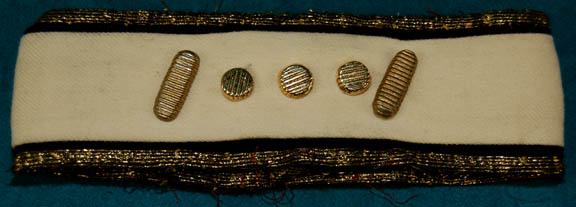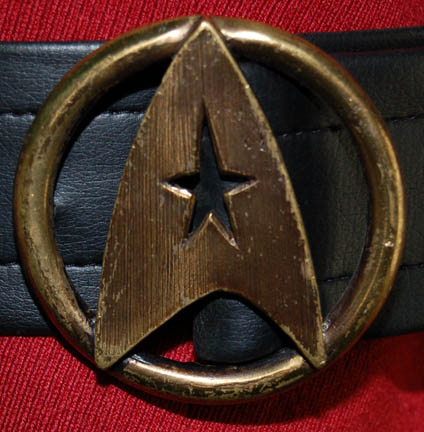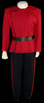 Description: A costume featured in the Star Trek: The Next Generation episode “Yesterday's Enterprise” for wear by Christopher McDonald in his portrayal of “Lieutenant (j.g.) Richard Castillo”, helmsman, and later captain, of the “USS Enterprise-C”. The costume is a set of black trousers with a red stripe down the outside seam of the legs, a white long sleeved shirt with a ribbed collar and cuffs, and a maroon officer’s jacket with and off-white interior double-breast, and a degree of separation between the black piping on the snap seal. The costume comes with a black leather belt with a gold colored metal Starfleet emblem buckle, a red placement with an affixed pair of silver and gold colored metal badges indicating the wearer to be a ‘lieutenant (junior grade)’, and a white shoulder division strip with an accompanying unattached metallic silver painted molded rubber ‘security device’ disk, and a pair of unattached silver gold colored metal badges indicating the wearer to be a ‘lieutenant (junior grade). Am accompanying white division strip for the left sleeve is bordered with gold trim and features two affixed gold colored metal commendation bars and three gold colored metal ‘5 year service’ pips, though “Castillo” actually wore only one of each in “Yesterday’s Enterprise”. The sewn in tag in the trousers wears ‘Christopher McDonald’, the other costume elements are tag less except for the belt with features a label reading ‘Jon Horback’.