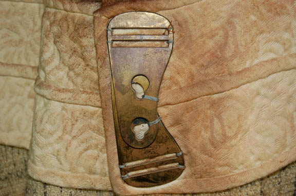 Description: The Klingon chef (Ron Taylor) owned a Klingon restaurant onboard Deep Space 9 serving authentic Klingon cuisine. He was featured in the Star Trek: Deep Space Nine episodes “Melora” and “Playing God”. The costume includes a cream woolen jacket with a cream textured band around the waist. It is intentionally distressed by adding brown coloring most notably to the front and shoulders. There are two overlapping metal accents on the front and the jacket fastens with snaps. The jacket comes with corresponding cream textured parachute trousers. Two X-large white t-shirts are also included. Costume comes complete with costume tag. A sewn in tag indicates this costume was also used during the Star Trek: The Next Generation series.