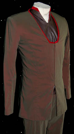 Description: A costume featured in the Star Trek: Voyager episode “Riddles”; wherein “Voyager” is attacked by an undetectable, supposedly mythical race called the Ba'Neth. This costume is for wear by Mark Moses in the role of the Kestet deputy investigator trying to prove to his superiors that the Ba’Neth are not just a myth, “Naroq”, and is a sleeveless, black, shirt in a textured, faux-reptile skin design, black piping, crimson accent around the collar, a long-sleeved, brown jacket of a slightly reflective material, a low v-neck with the same crimson accent, matching overall-style trousers, and stirrups for the feet. Mark Moses is perhaps better known from the Star Trek: Enterprise pilot episode “Broken Bow” where he played “Henry Archer”, father of “Captain Jonathan Archer” (Scott Bakula) a primary developer of the first warp five engine. A sewn in tag reads ‘Voyager, Mark Moses’ and a costumer’s tag reads ‘Voyager 227 Riddles, Naroq, Mark Moses’.
