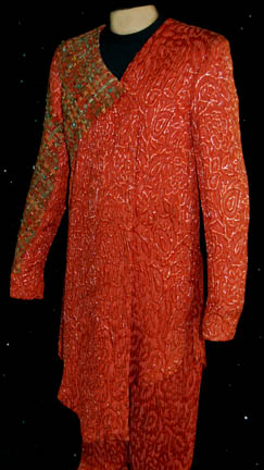 Description: A costume created for the Star Trek: Voyager episode “Prime Factors”, wherein “Voyager” finds a planet akin to the pleasure planet of “Risa” that has the ability to send them over half of the way home. This costume was created for but never actually worn by Ronald Guttman in the role of magistrate of Sikaris, “Gathorel Labin”, and is a long-sleeved, orange robe featuring a reflective, textured, flora pattern, a patch over the right shoulder and arm with numerous colors of fabric woven together and beaded accents of many shapes and sizes; two wrap-around flaps that overlap to cover the black lining and zip down the front, and corresponding, orange textured trousers. A sewn in tag reads ‘Voyager, Ronald Guttman' and the costumer’s tag reads ‘Voyager 110 Prime Factors, Ronald Guttman, Not Worn’.