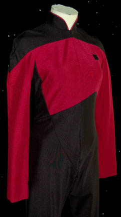 Description: A Star Trek: The Next Generation female Command red Starfleet uniform made for wear during the series and/or ‘The Next Generation' movies. The jumpsuit is black with Command red sleeves and upper torso. There is red trim around the collar, a small Velcro patch on the left breast for a Combadge (not included) to attach and a zip up the front. Costume comes with costume tag.