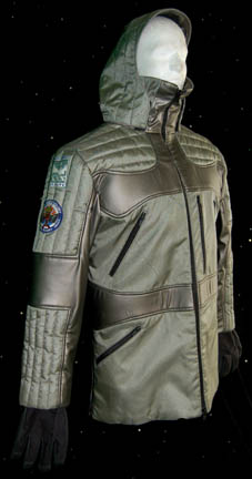 Description: A costume featured in the Star Trek: Enterprise episode “Regeneration”, wherein a group of scientists find the remains of a Borg vessel, are promptly assimilated by the drones that they revive, and the “Enterprise NX-01” is called in to track down the drones after they take the scientists' ship and heavily modify it. The costume is for wear by John Short in the role of one of the hapless archeologists that have no idea what they have come upon when they find the remains of a Borg vessel and two drones, “Dr. Drake”, and is heavy coat of a reflective silver color with a high collar, a close fitting hood, an “Earth Sciences Institute”, an “Arctic Archeology” patch, both on the right shoulder, a heavy duty zipper down the front, and a soft off-white long sleeved shirt with a zipper partially down the front, a little embroidered dinosaur skeleton near the waist hem, and a pair of black leather thermal gloves that tighten around the wrist. A sewn in tag reads ‘Enterprise, John Short’ and the costumer’s tag reads ‘Enterprise #049 Regeneration, Drake, John Short’.