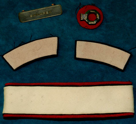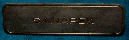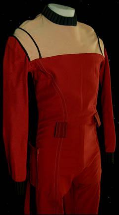 Description: A Starfleet uniform jumpsuit appearing in various Star Trek feature films, the costume is a red jumpsuit with a tan shoulder and chest, a ribbed collar and cuffs, both black indicating the wearer to be a crewman. The costume comes with an unattached pin backed name badge reading ‘SANAREK' in etched lettering, an unattached command white division strip for the left forearm, a pair of unattached white division strips for the shoulders, and a red placement for an affixed silver and gold colored metal badge indicating the wearer to be the rank of ‘senior chief petty officer’.