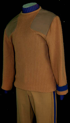 Description: A security officer's field duty uniform featured in Star Trek V: The Final Frontier during scenes taking place on Nimbus III. The costume is caramel colored wool trousers with a purple stripe running down the outside seam of the legs, a matching sweater top with a purple division strip on the left forearm, and a purple long sleeved undershirt with a ribbed collar and cuffs. The costume comes with an unattached silver and gold colored metal rank badge indicating the wearer to be an ‘ensign’, the division strip reveals evidence of a previously affixed badge in the way of loose threads.