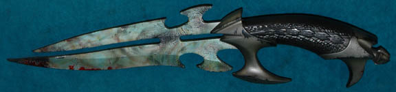 Description: A prop knife featured in Star Trek X: Nemesis for use by “Shinzon” (Tom Hardy) during a fight scene involving “Captain Picard” (Patrick Stewart). The item is a rubber knife replica with a molded grip and green painted ‘blade'. The guard and pommel are painted metallic silver and the ‘blade’ features remaining special effects ‘blood’. The item measures approx. 50 X 3.75 inches.