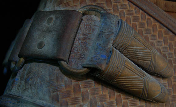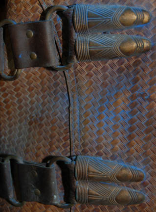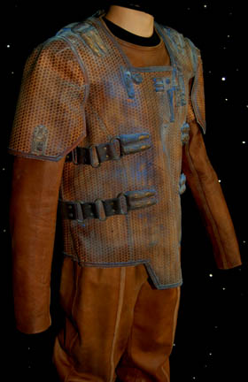 Description: A costume featured in the Star Trek: Enterprise episode “The Xindi”, wherein we catch our first glance of a Xindi in a trillium mining planet on the edge of the Delphic Expanse. The costume is that of one of the guards in the mining facility and is a brown, leather, overall-style trousers with stirrups for the feet, a brown leather long sleeved shirt, a heavy-duty woven tunic over the shirt with linked leather and metal belts and plastic accents that are distressed to look worn and exposed to mining conditions. Also included is the weapon used in that episode; a rubber cast, copper-colored phase carbine distressed in the same way.