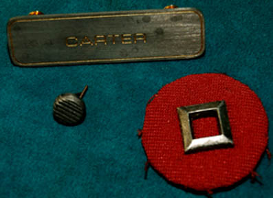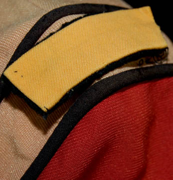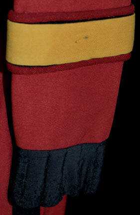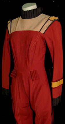 Description: A Starfleet uniform jumpsuit appearing in various Star Trek feature films. The costume is a red jumpsuit with a tan shoulder and chest, a ribbed collar and cuffs, both black indicating the wearer to be a crewman. The costume comes with an affixed yellow division stripe on the left forearm, a pair of affixed yellow division stripes on the shoulders, the one on the left is almost off the uniform, a pin backed name badge reading ‘CARTER', an unattached silver colored metal ‘5 year service’ pip, and a unattached placement with an affixed silver colored metal rank badge indicating the wearer to be an ‘able-seaman’.