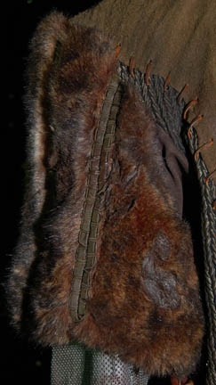 Description: A Klingon uniform costume featured in the Star Trek: Enterprise episodes “Bounty”, “The Expanse”, and “Borderland”. The costume is form fitting brown spandex trousers with a multi-fabric top including faux fur, leather, and fabric elements. The sleeves are silver colored metal ‘chain mail' with gold colored metal ringlets distressed to appear ‘rusty’. The fur is spotted and bunched for accent, and the costume comes with a belt harness made from wound and wrapped pieces of leather with grommets and Velcro placements. The sewn in Enterprise tag lists multiple actors use, the costumer’s tag matches those actors names reading ‘Enterprise, Klingon, Ben Scott #051, Dan Desmond #052, David LaBell #080’.
