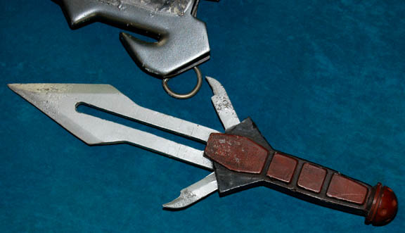 Description: A prop Klingon weapon featured in the Star Trek: Enterprise episode “The Augments”; wherein “Arik Soong” (Brent Spiner) and his band of augmented humans try to start a war with the Klingons. This weapon is the D'k Tahg, it is the traditional knife of the Klingon warrior and probably one of the most recognizable weapons in the Star Trek pantheon; it is a reinforced rubber knife with a single, straight primary blade and two little blades sticking out from the sides. The handle is black rubber with brownish-red accents, a design on the butt that represents an unnamed Klingon house; also included is a gray, molded-plastic sheath for the knife with a plastic accent that has halfway broken off, two hoops to attach it to a belt and a gray strap to tie it with. The knife has minor cracking in the surface of the rubber but the worst damage by far is the broken accent on the sheath. The item measures approx. 17 X 6 X 1.5 inches.