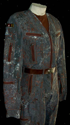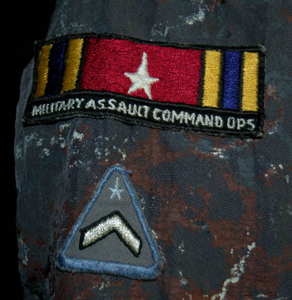 Description: A costume featured in several episodes of Star Trek: Enterprise for wear by the MACO, Military Assault Command Operations, essentially the 22nd century equivalent to the Marine Corp Special Forces. The costume is a long sleeved duty fatigue jacket of distressed urban camouflage with functioning pockets, zipper up the front, zipper/Velcro cuff adjustment, a sewn in undergarment, corresponding trousers, boots, a brown t-shirt, leather gloves and belt. The jacket includes embroidered patches with the MACO insignia, name patch for “N. Myers” on the right shoulder and rank patches of Private on the left shoulder although no one was actually referred to as “Private” on the show, just collectively as MACO's. The assault kit contains an equipment belt, belt keeper clips, rubber cast EM-33 pistol and corresponding holster, simulated metal stun baton, one light up stun grenade (depression switch activation, flashing blue LED lights and unknown power source), one foam rubber one, foam rubber prop scanner, one compressed rubber Starfleet Energy Carbine with black nylon strap, one clip pouch for the EM-33 with three clips, and one backpack in the same urban camouflage and black nylon straps. A sewn in tag reads ‘Enterprise, Ricky Lomax’.