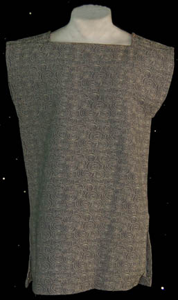Description: A lot of three Klingon style tunics featured in various Star Trek: The Next Generation episodes. The items are sleeveless and have wide necks, one it pleated, one is vinyl with patterned perforations, and the other it patterned, all three are grey colored.