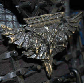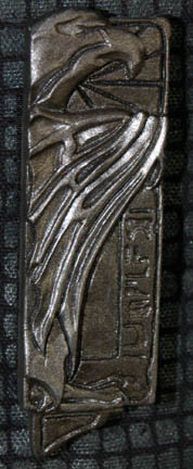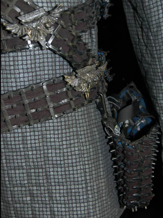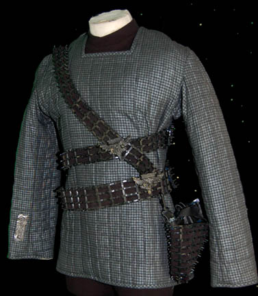 Description: A Romulan costume featured in various episodes of Star Trek: Deep Space Nine for wear by Tal'Shiar operatives. The costume is a full length black thermal jumpsuit with a square patterned quilted uniform jacket top. The top features collar line zips and iridescent silver square pattern. The costume is completed by an asymmetrical belt harness made from Dry-Deck and neoprene filler, with a wired on disruptor holster and four wired on cast resin Romulan Star Empire imperial eagle emblems depicting a bird of prey swooping toward the viewer with the worlds of Romulus and Remus clutched in its talons. Also included is a cast resin Tal’Shiar badge affixed to a Velcro placement on the right sleeve cuff depicting the Romulan imperial eagle in side view with Romulan iconographic lettering beneath its outstretched wing. The holster features a Velcro strap to keep a weapon (sold separately) in place. The costume features sewn in Deep Space Nine and Star Trek: The Next Generation tags indicating use by various actors and a corresponding costumer’s tag.