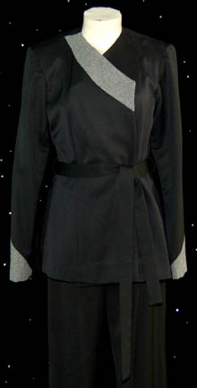 Description: A costume featured in Star Trek: Deep Space Nine episodes like “Sons of Mogh” and “Bar Association” for wear by Terry Farrel in her portrayal of “Jadzia Dax”. The costume appears during a scene in which Dax realizes that “Worf” (Michael Dorn) is about to perform a suicide ritual with his dishonored brother “Kurn” (Tony Todd). The costume is a black martial arts outfit in two pieces comprised of black trousers with a matching long sleeved top and a gray stripe down the right collar half with grey cuffs. The top has an asymmetrical snap front and an internal waist tie. Both garments feature sewn in Deep Space Nine tags reading ‘Terry Farrel' and the costumer’s tag reads ‘DS9 #487, Dax, Terry Farrel, Klingon Gi outfit + stunt double’. No stunt costume is present.