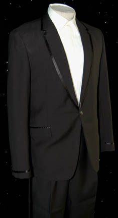 Description: A tuxedo featured in various episodes of Star Trek: Deep Space Nine like “Badda-Bing Badda-Bang” for wear by Avery Brooks in his portrayal of “Captain Sisko”. The tux is name brand with sewn in an original manufacturers tag by ‘Sy Devore' of Sherman Oaks, California, with two white tuxedo shirts featuring pleated fronts and extra wide cuffs, the costume comes with trousers and a pair of shiny shoes. The shirts feature tags which read ‘A B, 1998’, the jacket features a tag inscribed ‘Avery Brooks’ and the costumer’s tags read ‘Avery Brooks, Sisko’ and list the components.