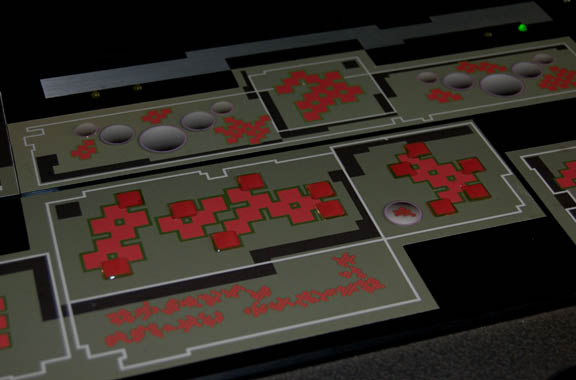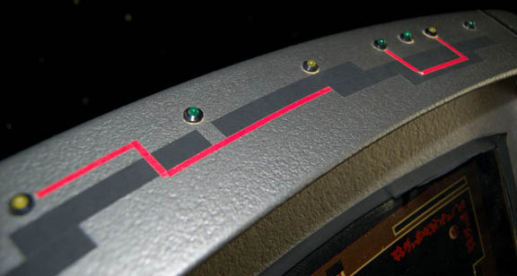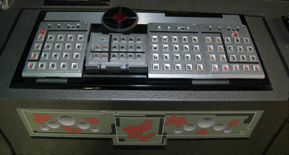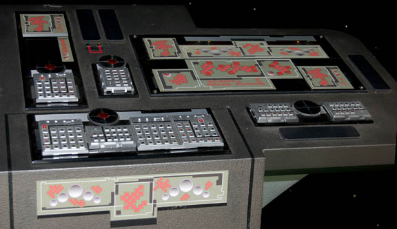 Description: A large, freestanding set piece remaining from the Star Trek: Enterprise episodes “Storm Front, Parts I and II” where the “Enterprise NX-01” crew returns to Earth from a harrowing journey only to find themselves trapped in the middle of an altered timeline of World War II. With alien help, the Nazis managed to take over parts of the eastern United States utilizing technology from that era mixed with alien experience. The aliens, known as the Na'kuhl, are attempting to return to their own timeline and have built multiple computer units, this being one of them. While the item appeared in various episodes of Star Trek: Voyager as part of the sickbay set, it has been repainted and outfitted with new acrylic ‘display screens' and interface panels. The item features two backlit screens with Voth alien iconography, a series of button panels with spring back buttons all featuring alien character lettering, multiple flashing lights powered by a single 9volt battery activated by a switch mounted on the underside with power still remaining from production use, a second set of top mounted lighting exists and is also powered by an additional 9volt battery which does not have an external switch, and an inscription on the base reading ‘Sickbay-Voyager, Future Ship-ENT’. Additionally the item features multiple Voth themed graphical applications. The item is on casters and rolls easily from one place to another, the backlighting for the ‘screens’ are powered by a single cable with a standard American type-A three pronged 120voly plug. The item measures approx. 68 X 46.5 X 27 inches.