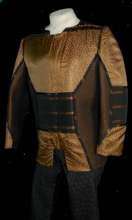 Description: A costume featured in various episodes of Star Trek: Deep Space Nine including “In the Pale Moonlight” for wear by Andrew Robinson as “Garak”. The costume is black colored diamond texture patterned trousers with and copper, brown, and cartouche colored top built on neoprene. This beautiful costume comes with a pair of black leather shoes that feature labels inscribed ‘Andrew Robinson', the costume is adorned with Deep Space Nine labels reading the same, and the costumer’s tag reads ‘DS9 Garak, Andrew Robinson’ and lists the colors of the top.