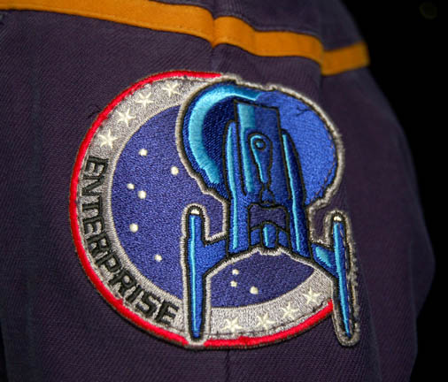 Description: A costume featured in various episodes of Star Trek: Enterprise. This costume is the standard 22nd century Starfleet uniform; a full-length, long-sleeved jumpsuit with a Command Gold Division strip, six functional zip pockets, zip/Velcro cuff adjustment on the wrists and ankles, an “Enterprise NX-01” patch on the left shoulder, two rectangular pips denoting the rank of lieutenant on the right side of the chest, a zip up the front, and a black, button down, sleeveless undershirt. A sewn in tag reads ‘Enterprise, Damion Williams, Richard Bai'.