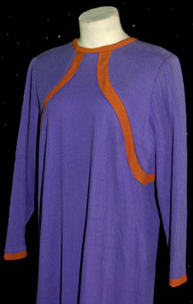 Description: A purple colored Bajoran surgical gown featured in various episodes of Star Trek: Deep Space Nine. The gown is open backed with multiple ties, made from a crumple textured fabric, and features orange stripes around the arms at the tops of the sleeves and cuffs. The sewn in Deep Space Nine tag reads ‘Rosalind Chao' who portrayed “Keiko O’Brien” through the whole series. The costume also features a sewn in tag reading ‘Faith Salie’ who portrayed “Sarina Douglas” in the episodes “Statistical Probabilities” and “Chrysalis”, the episode in which she wore the gown.