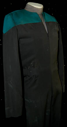 Description: A vaguely distressed Starfleet uniform composed of a black jumpsuit with sciences blue shoulders and grey turtleneck undershirt for wear by Siddig El Fadil in his portrayal of “Dr. Bashir” in seasons one through five of Star Trek: Deep Space Nine. The costume is distressed in that it features a degree of ‘scorch' marks on the blue yoke and dried special effects stains on the jumpsuit. The sewn in Deep Space Nine tags read ‘Siddig’ and ‘backup’ and the costumer’s tag reads ‘DS9 Bashir, Siddig El Fadil,…. Seasons 1-5, distressed’ and lists the components.