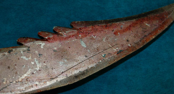 Description: A prop weapon similar to those featured in various episode of Star Trek: Enterprise. This item is a prop knife with a textured spiral design around the hilt, a twelve inch blade that is serrated on both sides, and “blood” stains along the blade. The item measures approx. 17.5 X 2.5 inches.