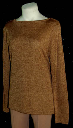 Description: A costume featured in the Star Trek: Voyager episode “Dark Frontier”; wherein “Seven of Nine” (Jeri Ryan) is forced to rejoin the Borg in order to save the rest of “Voyager” from being assimilated but the crew mount a rescue to get her back. This costume is for wear by Laura Stepp as the exobiologist and mother of “Annika Hansen”, “Erin Hansen”, and is a long-sleeved shirt featuring a brown speckled pattern and tan, corduroy trousers with stirrups for the feet. A sewn in tag reads ‘Voyager, Laura Stepp'.
