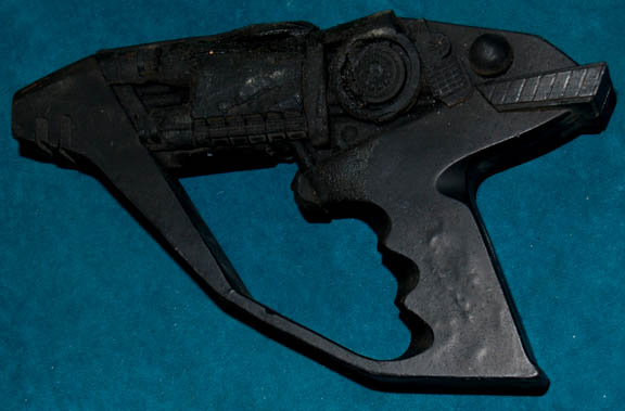 Description: A prop energy pistol featured in various episodes of Star Trek: Voyager like “Concerning Flight” and “Retrospect”. This style of weapon has also appeared as a Jem'Hadar hand gun in multiple episodes of Star Trek: Deep Space Nine. The item is sturdy black molded rubber with molded details and a degree of distress on the left side in that the item appears scorched. A degree of remaining dried adhesive is present at the fore of the prop indicating a missing emitter tip. The item measures approx. 8.5 X 5.25 X 2.5 inches.