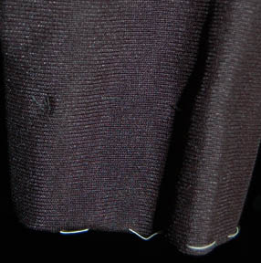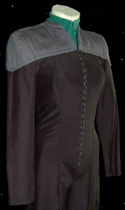 Description: A costume made for “Ezri Dax” (Nichole de Boer) in the seventh season of Star Trek: Deep Space Nine with elements of used costumes. The item is an unfinished Starfleet uniform composed of a black jumpsuit with grey quilted shoulders and two sciences blue division sleeveless turtleneck undershirts. The shirts depict a degree of fading from time and storage, the jumpsuit features white thread markings where it is ‘unfinished'. The garments all feature sewn in Deep Space Nine tags reading ‘Nichole de Boer’ and the costumer’s tags read DS9 season 7, Ezri Dax, Nichole de Boer unfinished SF uniform’, or ‘2 blue t-necks’.