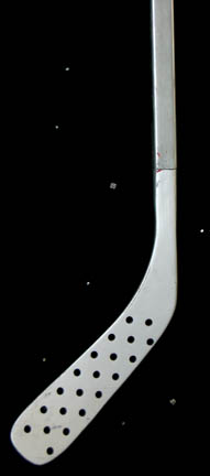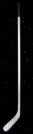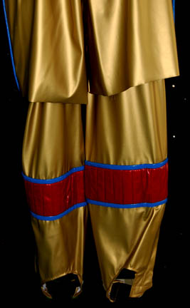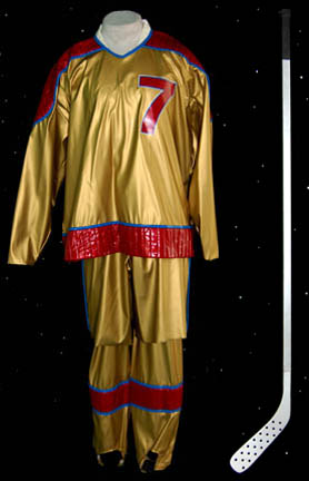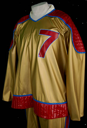 Description: A costume featured in the Star Trek: Voyager episode “Critical Care”; wherein a shady merchant named “Gar” steals “The Doctor's” (Robert Picardo) is stolen and he is sold to a man on a tremendous medical ship. This costume is for wear by Garrett Wang in the role of the “Voyager” Operations Officer, “Ensign Harry Kim”, and is a gold vinyl hockey uniform featuring red, quilted accents along the shoulders and waist, blue piping, a red “7” on the left breast area, corresponding short pants with enough room in them for pads (not included), and matching, full-length trouser legs that slide on like socks. Also included is the hockey stick from this scene; gray, composite plastic with black tape around the butt end. A sewn in tag reads ‘Voyager, Garrett Wang’.
