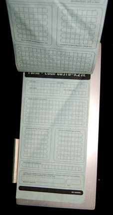 Description: A metal prop clipboard featured in the Star Trek: Deep Space Nine episodes “Past Tense, Parts I and II”. The item is one of the clipboards handed to “Commander Sisko” (Avery Brooks) or “Dr. Bashir” (Alexander Siddig) by “Vin” (Dick Miller), or handled by any of the other waiting room characters in the Sanctuary District. The item features two sheets of blue colored paper with a large black heading inscribed ‘Medical Services Request' with a large graphic of the seal of the Sanctuary Districts of San Francisco, California. The sheets are adorned with multiple check boxes and medical questions. Some of the boxes have been filled on the first page, the second is blank, both sides of each page are different. The clipboard is thin and features a heavy duty clip, and a welded on tube as a pen keeper. The item measures approx. 15 X 7.5 X 1 inch.