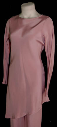 Description: A 2-piece set of pajamas made from pink silk with an asymmetrical hem. The item features a sewn in Deep Space Nine tag reading ‘Nana Visitor' and the costumer’s tag reads ‘DS9 #527, Kira, Nana Visitor’ and lists the components. Episode #527 is listed as being “Rocks and Shoals” in the “Star Trek: Deep Space Nine Companion” by Terry J. Erdmann, though no evidence of “Kira” wearing pajamas in the episode could be found.
