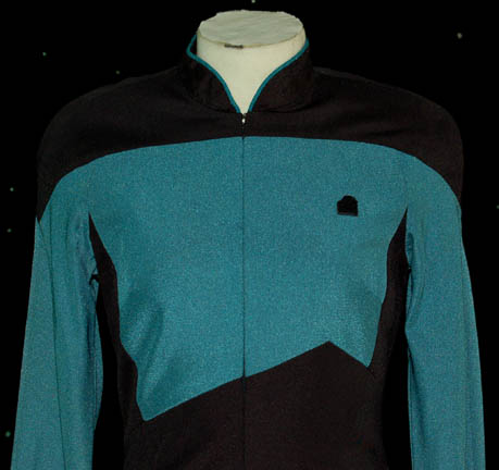 Description: A costume featured in various episodes of Star Trek: The Next Generation. This costume is a standard, Type-A, Starfleet uniform in the Next Generation style consisting of a full-length, long-sleeved jumpsuit with black trousers, Sciences Division blue around the abdomen and arms, more blue piping around the collar, a Velcro patch for a commbadge (not included), a zip up the back, stirrups for the feet.