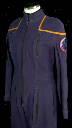 Description: A female Starfleet jumpsuit with Command gold trim around the shoulders made for use during the Star Trek: Enterprise series. It has a famous NX-01 Enterprise patch on the left sleeve, a zip up the front and multiple zippered pockets. There are zips and adjustable Velcro fasteners at the cuffs and ankles. Worn under the jumpsuit is a sleevless black shirt with buttons up the front. Costume comes complete with costume tag.