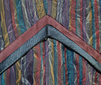 Description: A costume featured in the Star Trek: Deep Space Nine episode “Chrysalis”; wherein “Dr. Bashir's” (Alexander Siddig) enigmatic band of genetically enhanced friends returns to DS9 in the hopes that the Dr. can correct the catalepsy that resulted from “Sarina’s” (Faith C. Salie) enhancements. This costume is for wear by Faith C. Salie in the role of the genetically enhanced and therefore cataleptic, “Sarina Douglas”, and is a short-sleeved, dress featuring multi-colored, thin, vertical stripes, an interesting, pressed, wrinkled texture with satin-like blue and mauve accents around the collar, bust line, and ankles. A sewn in tag reads ‘Deep Space Nine, Faith Salie’ and the costumer’s tag reads ‘DS9 #555, Sarina, Faith Salie’.