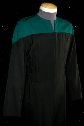 Description: A male Sciences Blue Starfleet uniform made for wear during the Star Trek: Voyager series. The uniform is black with Sciences blue shoulders, a small Velcro patch on the left breast for a Combadge (not included) to attach, a zip up the front and two pleats in the back. Around the waist are loops for away-team gear (not included) to attach. A gray long sleeved undershirt accompanies the jumpsuit. Costume comes complete with costume tag.