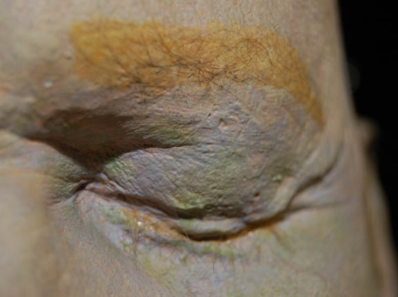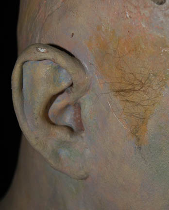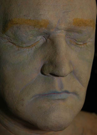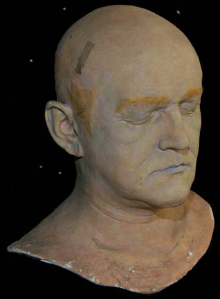 Description: This impressive bust is “Miles O'Brien” (Colm Meany) who first served onboard the U.S.S. Enterprise-D as Transporter Chief during the Star Trek: The Next Generation series and later as Chief of Operations onboard Deep Space 9. Made of plaster, the bust shows every detail of O’Brien’s face including pores and blemishes. The bust is painted giving O’Brien a deathly appearance. Small hairs were applied for eyelashes, some of which still remain and there are also remnants of hair for the eyebrows and head. Two pieces of Topstick also remain, presumably where a wig was attached. Measures approx. 13 ½ x 12 x 9 inches.
