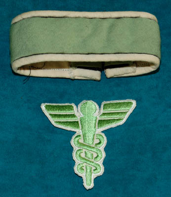 Description: A Starfleet sickbay costume first appearing in Star Trek I: The Motion Picture and again in Star Trek II: The Wrath of Khan. The costume is off-white trousers with a matching smock that comes with a green medical division dickie with a ribbed collar. The costume also comes with these unattached elements; a green division strip for the left forearm, a green cadesus patch for the left breast, and a pair of green division-rank strips for the shoulders with gold thread triangles indicating the wearer to be a ‘petty officer' (not pictured). The costume without the dickie and the sleeve division strip is a Star Trek II configuration while with a cadesus and shoulder mounted division-rank strips is a Star Trek I configuration. The costume is intended for female wearers.