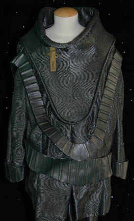 Description: A costume featured in the Star Trek: Voyager episode “Tinker, Tenor, Doctor, Spy”; wherein Hierarchy aliens think they are performing reconnaissance on “Voyager” when they have actually tapped into “The Doctor's” new “daydream” program. This costume is for wear by Googy Gress in the role of the Hierarchy Overlooker and is a long-sleeved jacket featuring a textured, wavy, metallic silver pattern, gray, latex accents around the cuffs, a matching, massively oversized collar, a resin cast rank insignia with alien script on it, a gray, latex bandolier and belt that matches the cuffs, corresponding, overall-style trousers, and stirrups for the feet. A sewn in tag reads ‘Voyager, Googy Gress’ and the costumer’s tag reads ‘DS9, Tinker, Tenor, Doctor, Spy, Googy Gress’