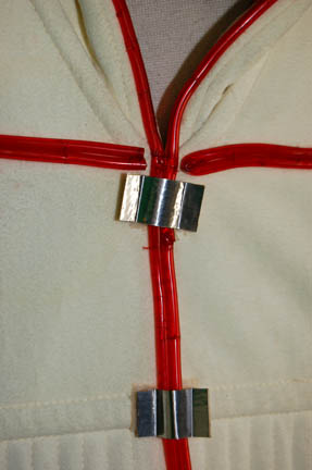 Description: An extremely soft cream colored sickbay patient costume featured in Star Trek I: The Motion Picture. The costume is trousers and a matching sleeveless shirt with a hood that features an orange interior lining. Both costume pieces feature red plastic tubing affixed by way of silver colored foil attachments. This fine representation is intended for male wearers.