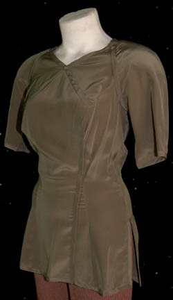 Description: A costume featured in the Star Trek: Deep Space episode “Prodigal Daughter”; wherein “Ezri Dax” (Nicole de Boer) goes back to her home in the Sappora system to elicit her mother's assistance in finding the missing “Chief O’Brien” (Colm Meaney). This costume is for wear by Leigh Taylor-Young as the Tigan matriarch and “Ezri’s” mother, “Yanas Tigan”, and is a short-sleeved, olive-colored, satin-like shirt featuring a sewn on wrap-around front, similarly olive-colored accents and trousers with brown and tan vertical stripes. A sewn in tag reads ‘Deep Space Nine, Leigh Taylor-Young’ and a costumer’s tag that is mislabeled as ‘DS9 #561, Yaman, Leigh-Taylor-Young’ when it should say “Yanas”.