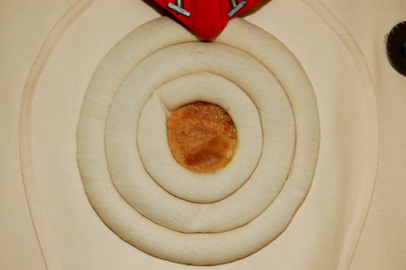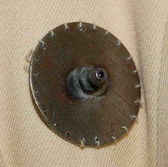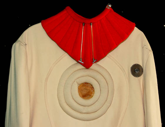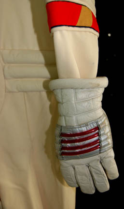 Description: A white Starfleet engineer's radiological suit appearing first in Star Trek I: The Motion Picture and continuing use through Star Trek VI: The Undiscovered Country. The costume is a full length white jumpsuit with a quilted waist and circular chest accent, matching quilting occurs around the sleeves. The costume comes with a sewn on red trainee’s division strip around the left forearm with a yellow flash through it indicating an intention to become a crewman engineer, and a yellow backed Starfleet emblem patch sewn onto the left sleeve forearm. The costume comes with these unattached elements: A copper and gold colored foil centerpiece accent, a pair of yellow division strips for the shoulders, a white placement and an attached silver colored metal badge indicating the wearer to be a ‘petty officer 1st class’ rank, two pin backed name badges with the name ‘ZANATOS’ etched into them, a red ribbed collar indicating the wearer to be a trainee, a pair of white gloves with red tubing, a single ‘thermal’ accent with red tubing, a pair of silver colored metal rigging loops meant to be mounted to the uniform front above the waist, and a reflective silver item encased in acrylic meant to be mounted on the left waist. This costume representation is one of only a handful in the entire remaining collection to retain an intact yellow backed Starfleet emblem patch sewn onto the left shoulder.