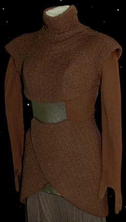 Description: A costume featured in the Star Trek: Deep Space Nine episode “Armageddon Game”; wherein “Dr Bashir” (Alexander Siddig) and “Chief O'Brien” (Colm Meaney) are presumed dead after one of the races with whom they are assisting to dispose of their stockpiles of biological weapons, decides to break the truce. This costume is for wear by Darleen Carr in the role of the T’lani representative that attempted to erase anyone and everything that had any knowledge of her planets’ biological weapons, “E’Tyshra” and is a long-sleeved, full-length, brown jumpsuit featuring textured vertical stripes, open gloves with a thumb and two fingers, stirrups for the feet, and a zip up the back; a sleeveless, legless, neoprene jumpsuit divided into an upper and lower portion but then reattached by two bare pieces of neoprene, the rest is covered in a brown fabric featuring vertical stripes in a textured, quasi-coiled design, a turtle-neck collar, matching trousers of a wrinkly design and overlapping, billowy legs. The trousers and jumpsuit have very minor fading due to time and storage. A sewn in tag reads ‘Deep Space Nine, Darleen Carr’ and the costumer’s tag reads ‘DS9 #433 Armageddon Game, E’Tyshra, Darleen Carr’.