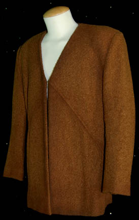 Description: A costume aspect featured in the Star Trek: Deep Space Nine episode “Honor Among Thieves”; wherein “Chief O'Brien” (Colm Meaney) infiltrates the Orion Syndicate to ascertain the identity of the Syndicate’s mole in Starfleet Intelligence. This item is for wear by Colm Meaney in the role of the Chief Engineer of Deep Space Nine, “Miles O’Brien”, and is a long-sleeved, brown, wool jacket in a tweed-like style with textured, diagonal accents on the front and back. The costumer’s tag reads ‘DS9, O’Brien, Colm Meaney’.