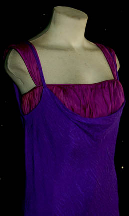 Description: A costume lot featured in the Star Trek: Deep Space Nine episodes “Fascination” and “You Are Cordially Invited…”; wherein “Lwaxana Troi visits Deep Space Nine and symptoms of her Xanthi fever are making people confess latent attractions to each other all over the station and “General Martok's” (J. G. Hertzler) wife comes aboard Deep Space Nine test the worthiness of “Lt. Commander Dax” (Terry Farrell) to join the “House of Martok” respectively. This costume lot includes a sleeveless, scarf-quality, silk, light purple dress featuring an empire waist, vertical pleats along the bust line; a darker purple dress of the same fabric sewn onto the outer one, the bottom about two-thirds of a purple jumpsuit sewn onto that as a pair of leggings and slight fading down the sides due to time and storage. Also included is a sleeveless, full-length, purple dress featuring a cowl neckline, a pressed wrinkly feel, a textured, circular design; a flesh-colored undergarment with a matching purple color along the top. The second dress was found in the same costumer’s bag with the first dress but could not be identified through screen caps. A sewn in tag reads ‘Deep Space Nine, Terry Farrell’ and the costumer’s tag reads ‘DS9 Fascination 456, You are Cordially 531, Dax, Terry Farrell’.